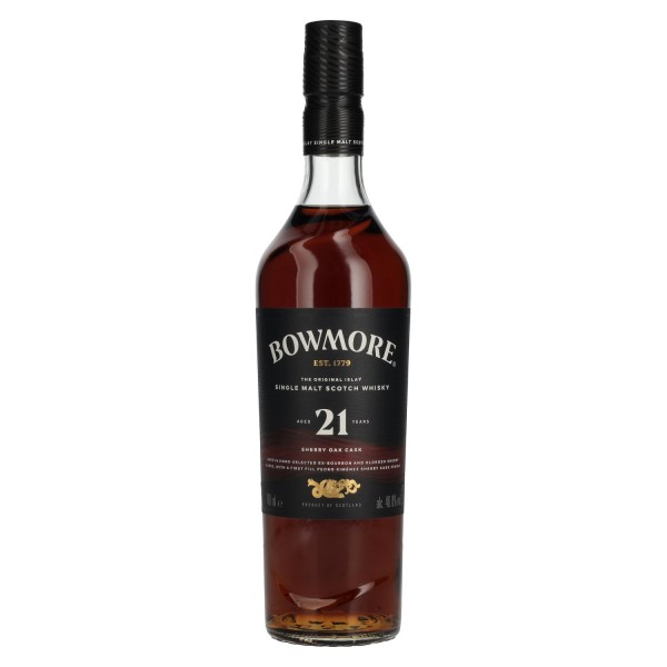 Bowmore 21 Years Old Sherry Oak Cask Islay Single Malt su 46,8% alk. tūrio ir 0,7 l talpa – išpilstymo dalis iš Bowmore Distillery, vienos seniausių ir žinomiausių distilerių Islay saloje.
