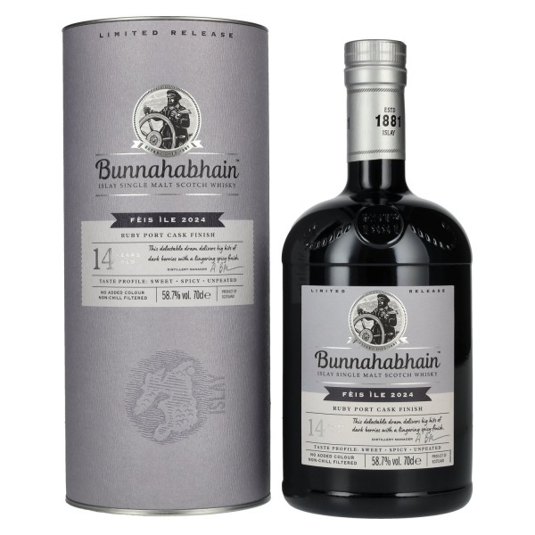 Bunnahabhain 14 Years Old RUBY PORT CASK Matured Limited Release 2024 yra svarbus viskio pavyzdys, kuriame derinamas brandinimo bruožų gilumas su įdomia variacija. Ši riboto leidimo linija sukurta minint garsųjį Fèis Ìle – Islay muzikos ir maltų viskių festivalį.