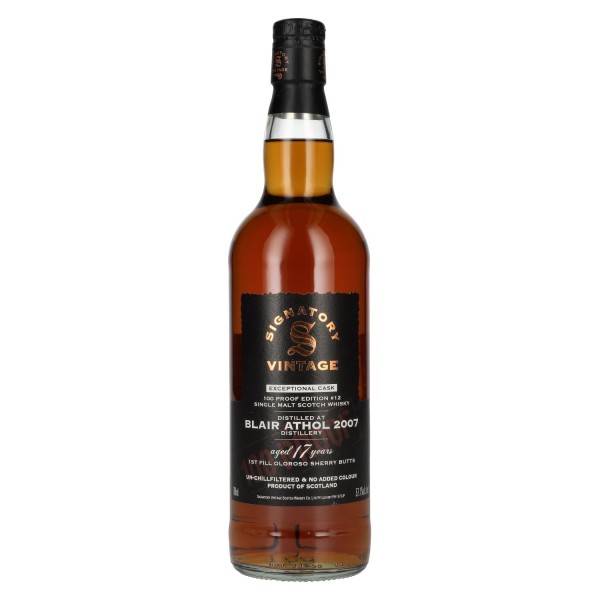 Blair Athol 17 Years Old iš Signatory Vintage 100 Proof Edition – tai galingas vieno salyklo viskis, kurio stiprumas siekia 57,1 % alk. tūrio, kilęs iš išskirtinės statinės #12.