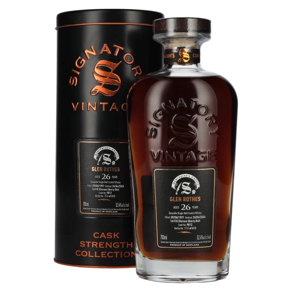 Signatory Vintage Glen Rothes 26 Years Old Cask Strength – išskirtinė vieno statinės išpilstymo (Single Cask) serija iš garsios Škotijos Speyside distiliavimo įmonės Glenrothes, žinomos dėl sodrių, vaisių natų single maltų. Išpilstytas Signatory Vintage, vieno iš geriausiai įvertintų nepriklausomų išpilstų Škotijoje, šis viskis kilęs iš 1997 metų ir brendo vienoje statinėje daugiau nei ketvirtį amžiaus – Nr. 9812.