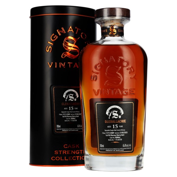 Yra Prekyboje Signatory Vintage GLENALLACHIE 15 Years Old Cask Strength #900864 2009 65,6% Vol. 0,7l metalinėje dėžutėje