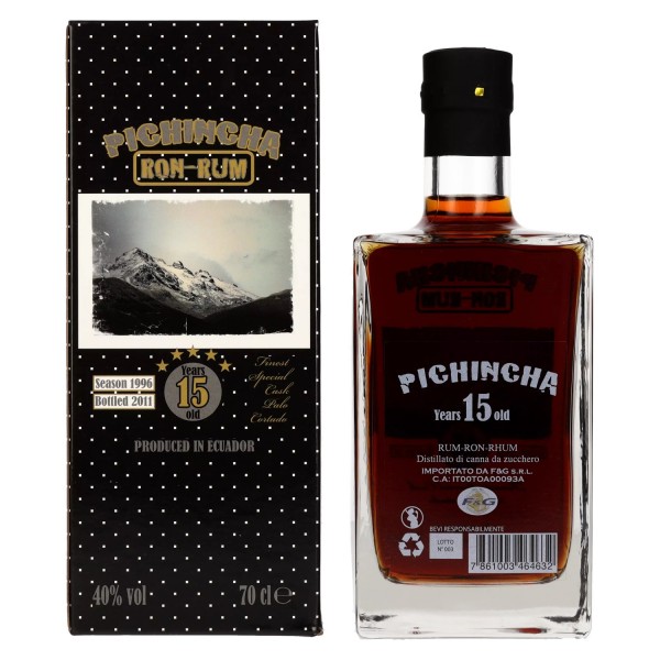 Pavadintas garsiojo vulkano Pichincha Ekvadore, šis romas kilęs iš šalies, kuri yra žinoma dėl itin švelnaus cukranendrės skonio. Romą brandina 15 metų Ex-Bourbon statinėse, o vėliau tobulina retose Palo Cortado šerio statinėse. Ši nepaprasta pabaiga sukuria įdomią vaisių, riešutų ir prieskonių aromatų harmoniją, dėl kurios Pichincha romas tampa tikru gurmanų skonių šedevru.