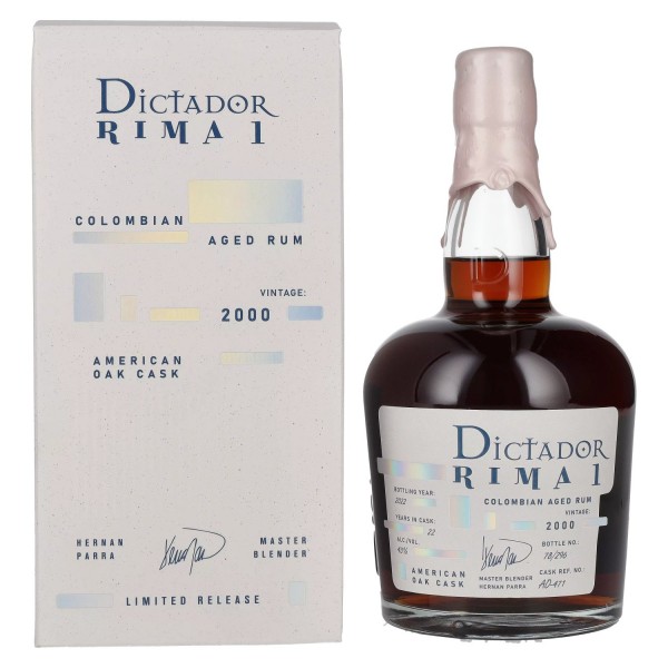 Dictador RIMA 1 22 Years Old American Oak Cask Vintage 2000 yra išskirtinė, griežtai riboto leidimo serija RIMA, žinoma dėl armoningo balanso ir tiksliai atlikto statinės brendimo. Įkvėpta tobulo poeto simbiozės, ši serija atspindi meistrų blenderio Hernano Parro įgūdžius, kuris asmeniškai prižiūrėjo šių išskirtinių metų atranką.