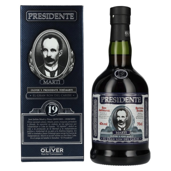 Presidente Martí 19 sudarytas iš kruopščiai atrinktų melasos distiliatų, kurie branda Amerikos ąžuinėse statinėse ir buvusių šerio statinėse. Dėl Solera sistemos, kur jaunieji ir vyresnieji romai nuolatos maišomi, gaunamas ypatingai harmoningas ir kompleksinis aromatinis profilis. Rezultatas – pilnas kūnas ir švelnumas su giliu balansu tarp saldumo, prieskonių ir vaisių užuominų. Dovanų dėžutė pabrėžia jo aristokratišką charakterį ir suteikia papildomą žavėjimą tiek kolekcionieriams, tiek mėgėjams.