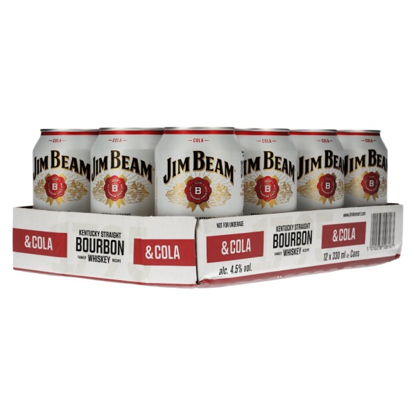 Jim Beam & Cola yra praktiška ir populiari paruošto vartojimo (Ready-to-Drink) versija vieno iš žinomiausių bourbon longdrinkų pasaulyje. Šioje 12 skardinių pakuotėje po 0,33 l mišinys iš originalaus Jim Beam Kentucky Straight Bourbon Whiskey ir gaivios kolos yra jau paruoštas vartojimui – patogus keliaujant, per šventes ar paprastam malonumui namuose. Su alkoholiniu stiprumu 4,5 % tūrio šis mišinys siūlo subalansuotą bourbono natų ir saldžiai gaivios kolos pusiausvyrą.