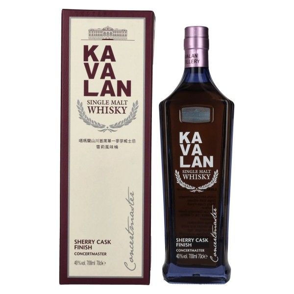 Kavalan Concertmaster Sherry Cask Finish Single Malt Whisky yra išskirtinis ir įvairesnis išpilstymas iš apdovanotos Kavalan distilerijos Taivane. Distilerija buvo įkurta 2005 m. T. T. Lee, King Car Group prezidento, siekiant gaminti aukščiausios kokybės viskį Taivane. Pavadinimas Kavalan kilęs iš regiono Yilan, esančio pietryčiuose nuo Taipėjaus. Šiame regione teka vienas iš geriausių Taivano vandens šaltinių – šviežias, šaltas šaltinis, tekantis per Snow Mountain, kuris sudaro pagrindą išskirtinei švarai ir kokybei šio viskio.
