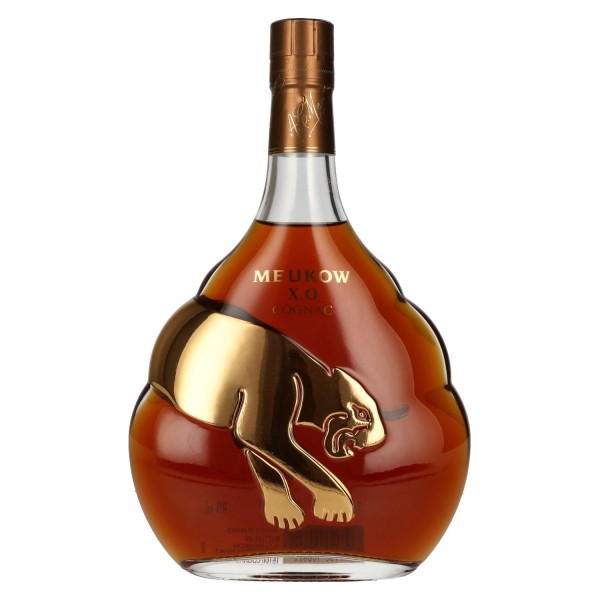Meukow X.O.. Gold Panther konjakas brandinamas ąžuolo statinėse mažiausiai 25 metus. Ant buteliuko esanti pantera pagaminta iš 24 karatų aukso.