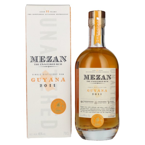 Mezan The Unaltered Rum Guyana 2011 – 46 % alk. tūrio, 0,7 l, dovanojimo dėžutėje – autentiškas Demerara romas iš Guyanos, atspindintis Mezan The Unaltered Rum serijos grynąjį požiūrį. Ženklas Mezan Rum reiškia ribotos kolekcijos kruopščiai atrinktų išpilstymų, kurie išlaiko pirminį karibinio romo charakterį. Visi šios serijos išpilstymai yra be cukraus pridėjimo, be dažiklių ir be šalto filtravimo, todėl distiliatas išlieka natūralus. Šis Guyana romas buvo distiliuotas 2011 m. Diamond Distillery ir išpiltas 2022 m., todėl įgijo 11 metų brandą. Gamyba vykdoma iš melasos, o distiliavimas atliekamas moderniose Savalle Four-Column distiliavimo kolonose. Brandinimas vyksta dvejais etapais: pirmiausia tropinis brendimas 3 metus Guyanoje, o po to dar 8 metus Europoje. Brandinimas vyksta Ex-Bourbon statinėse, todėl susiformavo subalansuotas statinės charakterio ir distiliato ryšys. Kaip Single Origin romas iš Guyanos, ši išpilstymas atspindi regioninį tradicinį stilių ir gilų Demerara romų pobūdį. Išpilstymas ribotas iki 5 500 butelių visame pasaulyje, todėl šis riboto tiražo Guyana romas ypač patrauklus kolekcionieriams ir tikriesiems romų mėgėjams.
