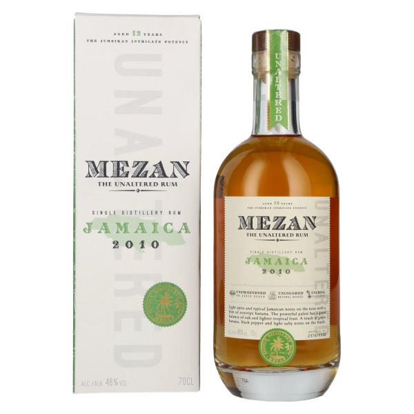 Mezan The Unaltered Rum Jamaica 2010 — autentiškas Jamaikos romas, atspindintis Mezan The Unaltered Rum serijos grynąjį stilį. Šis gėrimas yra be pridėto cukraus, be dažiklių ir be šalto filtravimo, o brandinamas iki optimalios brandos. Gamyba vykdoma Monymusk distilerijoje, Clarendon rajone, iš melasos, o distiliavimas atliekamas moderniais kolumniniais distiliatoriais. Šis Jamaikos romas buvo išpilintas 2010 m. ir 2022 m., todėl dar 12 metų brandintas. Brandinimas vyksta dvejais etapais: pirmiausia tropinėse Jamaikos sąlygose, o antrasis etapas – Europoje, Refill Bourbon statinėse. Dėl šios kombinacijos pasiekiama subalansuota pusiausvyra tarp stipraus distiliato ir elegantiško įspūdžio iš statinės. Leidimas ribotas – 5 500 butelių visame pasaulyje, todėl šis romas ypač įdomus kolekcionieriams ir romo mylėtojams. Pakuotė: dovanų dėžutėje.