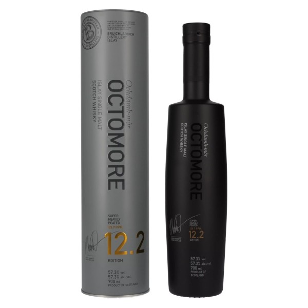 Bruichladdich Octomore Edition: 12.2 – labai stipriai torfiškai dūminis Islay viskis, kurio intensyvus charakteris ir galingi aromatai įspūdingi.