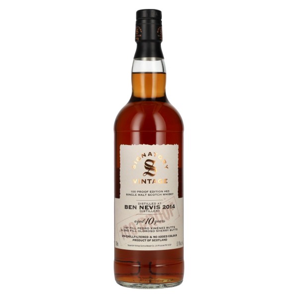 „Signatory Vintage 100 Proof Edition BEN NEVIS 10 Years Old Single Malt #63 2014“ – galingas Highland vieno salyklo viskis, kuriame susilieja Ben Nevis distilerijos charakteris ir Signatory Vintage požiūris į nepriekaištingą išraišką. Distiliuotas 2014 m. ir brandintas 10 metų distilerijoje, šis butelis išryškina tvirtą, šiek tiek aliejingą salyklo bazės charakterį. 100 Proof Edition pabrėžia aukštą stiprumą ir ryškią išraišką, o natūralu spalva bei be šalto filtravimo bei be dažiklių išlaiko viskio autentiškumą. Pasirinktas Single Malt statinės #63 tiksliai atskleidžia tipinį Ben Nevis stilių.