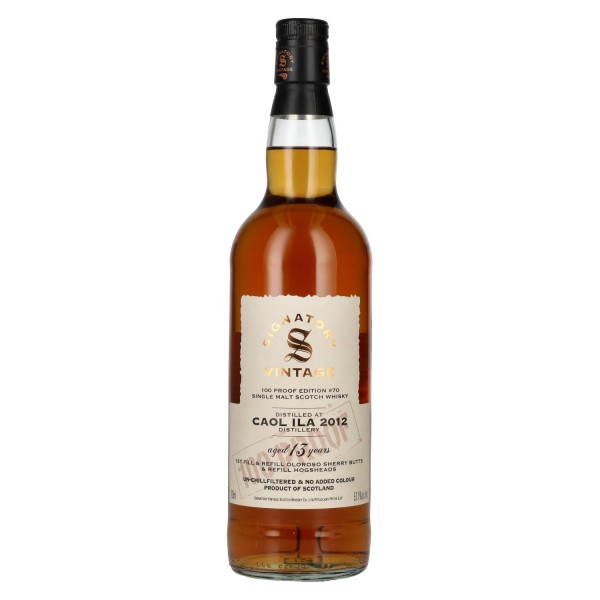 Signatory Vintage 100 Proof Edition CAOL ILA 13 Years Old Single Malt #70 2012 57,1 % alk. tūrio 0,7 l yra galinga ir be kompromisų išpilstyta klasikinio Islay vieno salyklo viskio versija, skirta žinovams ir mėgėjams, mėgstantiems stipriai dūminius viskius.