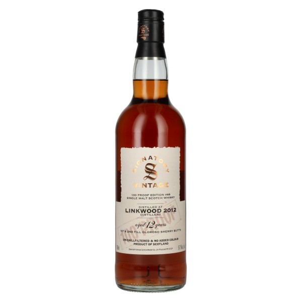 Iš nepriklausomo pildytojo Signatory Vintage ši leidimas kilęs iš Linkwood Distillery, garsėjančios švelniu, subalansuotu charakteriu. Distiliuotas 2012 metais ir brandintas 12 metų, šis viskis sujungia Speyside eleganciją su 100 Proof Edition intensyvumu, siekiančiu aiškią išraišką, tekstūrą ir skaidrumą. Parinktas Single Malt fasas #68 tiksliai atskleidžia vaisių, maltojo salyklo ir fasos struktūros charakteristikas.