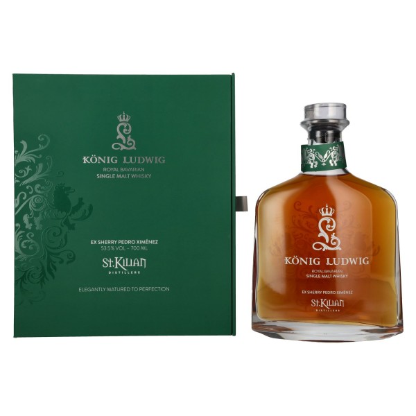 St. Kilian König Ludwig Single Malt Whisky Ex-Sherry Pedro Ximénez – vokiečių viskis iš St. Kilian Distillers. Brendimas Ex-Sherry Pedro Ximénez statinėse formuoja gilų, sodrų ir išraištingą profilį, o 53,5 % alk. tūrio užtikrina stiprų, bet subalansuotą charakterį. Ši dovanojimo dėžutėje pateikiama partija – puikus pasirinkimas viskio entuziastams.